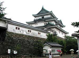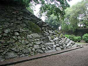 ![]() 野面積:自然石をそのまま大小に関係なく積み重ねる方法。 石垣の角度が大変緩やかなのが不思議に思える、これなら走って石垣を登れるようだ。 |