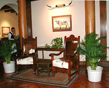 ![]() エレベーターホール前の椅子。 写真の牛の毛皮が貼ってある。 |