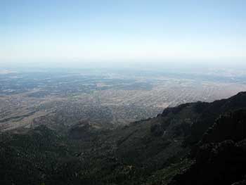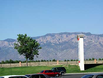| 6月22日(日) 8:30 朝食 ホテルの周りを散歩してみるが、あまりの暑さにすぐ引き揚げた。 10:30 頃 Mr,Ryan 夫妻が迎えに来て、サンディア山のロープウェイに向かう。 SANDIA PEAK TRAMWAY サンディア山の高さは海抜 3,164m 。 世界一長いロープウェイと言われてます。約4,500m の距離を時速 19km/hr で、15分で頂上まで運んでくれます。 |