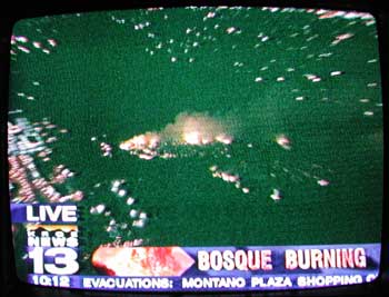 | 火事だ!! ホースライディングが済み、現場のLOS LUNASからの帰り道、フリーウェイから遠くに火事の煙が見えた。 結構大きな山火事かなーと思っていた。Mr,Ryan がカーラジオのスイッチを入れる、火事のニュースをやっているようだ。 Mr,Ryan の顔色が変わった。携帯電話を取り上げる、ボタンを押す指先が震えていた。 「自宅の近くの火事だ!」車のスピードが上がる・・・・近づくにつれ消防車やパトカーが増える。 自宅に到着、何時もは開いている門が閉まっている、車を道路に止め門の通用口か屋敷に駆け込む。 何時もは厩舎か柵で囲まれた運動場にいる2頭の馬が、家の周りを駆け回っている。子馬も1頭其の後を追いかけている。 Ryanの7歳の妹と、親父さんが水道のホースで庭の外に向って水を撒いていた。 水撒きを替わる。上空には消防ヘリが飛んできて盛んに水を撒いている。 Ryan 達は馬を運ぶトレーラーの支度を始める、何とか興奮している馬をトレーラーに積み込む。 道路ではパトカーが盛んにスピーカーでがなっている(避難の呼びかけのようだ)。 上空のヘリの水を落とす場所がだんだん近づいてきた、馬を積んだトレーラーを道路に出し様子を見てた。 いよいよ、ヘリの消火場所が近づいてきた、避難することにした。 敷地の中にある車5台で人間、馬3頭、犬1匹のみ、家財道具はなし。馬1頭が約\5,000万円くらいするそうだ。 Ryan のお母さんはワシントンDCに出張中、奥さんは実家に帰っているそうだ。 10分位走ったところに親戚か知人かの馬の厩舎と運動場がある家に到着。 馬をそこに放し、我々は道路で様子を見る。Mr,Ryan と Mr,H 氏が様子をみに行く。 2軒隣の家の庭の外まで火が来ていたそうだが、どうやらそこで治まったとのこと。 (2軒隣といっても、此処はアメリカ、1軒の敷地は広いです。) 夜の10時半を過ぎる頃我々はホテルに帰ることにする。ホテルのレストランも、もう閉まっている、ほかに食事するところが無いという。仕方なく避難所に行く。大きなホテルの会議室の様なところが避難場所となっていた。 食事の支度があるというのでそこに行ったが、置いてあったのは冷めたピザ、袋入りフライドポテト、飲み物。 飲み物にビールは無かった。広い部屋に椅子を沢山並べただけ、中央にテレビが置いてある。 ホテルに帰るが、今日は疲れてバタンキュー。夜中中テレビは火事の中継をしていた。 下の画像はその様子です。BOSQUEとはリオグランデ川のほとりの緑地帯のこと。 翌日聞いたところによると、延焼した住宅は2軒であった。 |