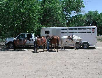 ![]() 往復はこのトレーラーに馬を積んで運びます。 |