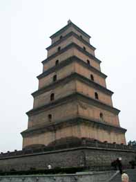 唐の高宗李治が母文徳皇后の菩提を弔うため隋時代の寺院を増改築し、「大慈恩寺」と改称したのが648年。その3年前、「西遊記」で有名な三蔵法師(玄奘三蔵)はインドから仏典を持ち帰り、この寺院に学者、高僧を集めて、漢訳を始めた。その経典を収納するため652年、境内に建てられたのがこの塔で、塔の入口の両側には、その功徳を讃えるため、太崇と高崇の「大唐三蔵聖教序」と「大唐三蔵聖教序記」の石碑が対になって嵌め込まれている。内側に木製の階段があり、最上階まで登れる。 当初は五層であったが、則天武后の時代に改造を行い十層になった。しかし戦乱などで上部が崩壊。現在は七層で高さは64mである。 「大慈恩寺」入園料:25元、大雁塔入場料:20元 夕食は西安で一番有名な餃子のお店「徳発長」にて。 ![]() |