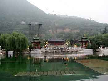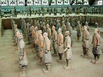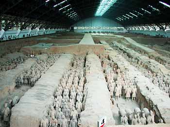 世界8番目の奇跡と呼ばれる世界遺産、二千百年余りも地下に眠っていた秦兵馬俑。 始皇帝の死後を永遠に守るために作られた、兵や馬の像は現在発掘されたものだけで六千体(1号坑)あるそうだ。 発掘された順に1号坑、2号坑、3号坑と名付けられた。 1号坑は最も大きく長さ230m、幅62m、深さ5m、総面積14260u。 1号坑は現在も発掘が続けられている。兵隊俑の平均身長は1.8m。胴体は空洞で顔の表情はそれぞれ異なり、服装も身分によってまちまちだ、全ての兵隊俑は手に武器を持っている。 殉死制度のあった時代に陶製の人形を身代わりに殉死品としたと見られる。 始皇帝陵から1.5km東の地点に在り、陵墓を守るために作られた。 始皇帝陵の発掘は保存技術が現在よりも進歩してか行うとの説明があった。 入園料:90元 |