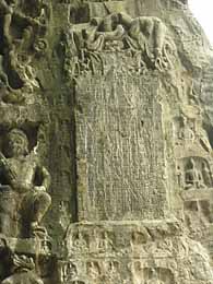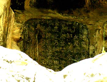 ![]() 賓陽洞の中洞入口左の壁面刻されている「伊闕仏龕碑」 痛みがひどいらしくレプリカが置かれてました。 |