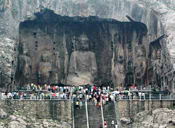 竜門石窟は、北魏の孝文帝・元宏年間(471〜499年)に造営がはじめられた。その後も東魏、西魏、北斉、北周、隋、唐、五代、北宋などの歴代王朝が、400年以上も開削をつづけてきた。そのうち、北魏と唐の時代に造営されたものが最大の規模である。竜門の洞窟で、北魏時代のものは全体の30%、唐代のものが60%を占めている。その他の時代に造られたものは、わずか10%ほどである。 統計によれば、竜門に現存する石窟は2345、石像は11万体あまり、仏塔は70以上、銘文や図などが刻まれた石碑は2860あまり、残されている文字史料は30万字以上。中国においても、古い石碑がもっとも多いところだという。2000年11月、竜門石窟はユネスコの世界文化遺産リストに登録された。 |