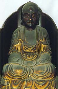 木造達磨大師尊像 総高 45cm 延宝六年(1678)の作。 像内の墨書により年代、作者等が分かります。 「爲本明智光信尼 寄附 施主中満勘右門 延宝六年 戌午 五月吉日 達磨大師之尊像 大佛師 坂上宮内法橋宗慶」 小品ながら優れた都仏師による精神性のこもった仏像となっている。寄進者は、鞆の商人中満(屋号)勘右門で、江戸前期の鞆の商人の経済力の豊かさもうかがえます。 |
