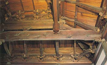 内部天井。 太い梁組や小さな部材を巧みに組み見事な構成美をなしており、美しい抽象彫刻を見るようです。 |