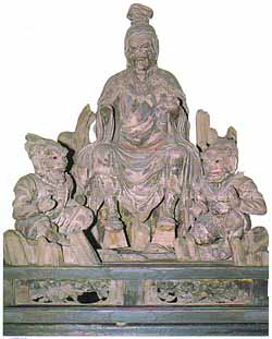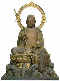 木造役行者像及び二鬼(前鬼後鬼)像 室町時代末期 市指定重要文化財 像高 役行者77.1cm、 前鬼(向かって右)31.0cm 後鬼(向かって左)34.2cm 修験道の開祖とされる役行者は、頭巾をかぶり高下駄をはき、前鬼(吽形)後鬼(阿形)の二鬼を伴う。 玉眼嵌入で彩色し、仏像彫刻の衰退する室町時代における肖像彫刻の優作である。 |