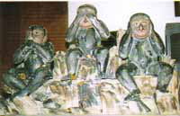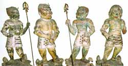 木造青面金剛立像及び三猿・二鶏・二童子・四鬼神像 江戸前期 市指定有形民俗文化財 中央:青面金剛立像 像高68.2cm その両端:二童子立像 像高27.9cm, 27.7cm 両端:二鶏像 像高21.5cm, 25.3cm 庚申信仰は、青面金剛に、病魔や災いを除いてもらうよう信仰された。 寺院内に「庚申堂あり、寛文年中(1661〜1673)に像立となり」(『あくた川のまき』1682年)とあり、江戸時代前期の作である。 寺院内の庚申信仰で、彫像がそろって伝存するのは他に例をほとんど見ない。 |