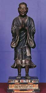 一遍上人立像 高さ55cm江戸中期の作と思われる。 一遍(1239〜1289年)は伊予(愛媛県)に生まれる。 1274年に時宗を開創。 |