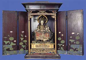 ![]() 清正公大神祗、腹こもり坐像 総高40cm 左の像を本像の腹に入るように、後世 につくられたもの。 |